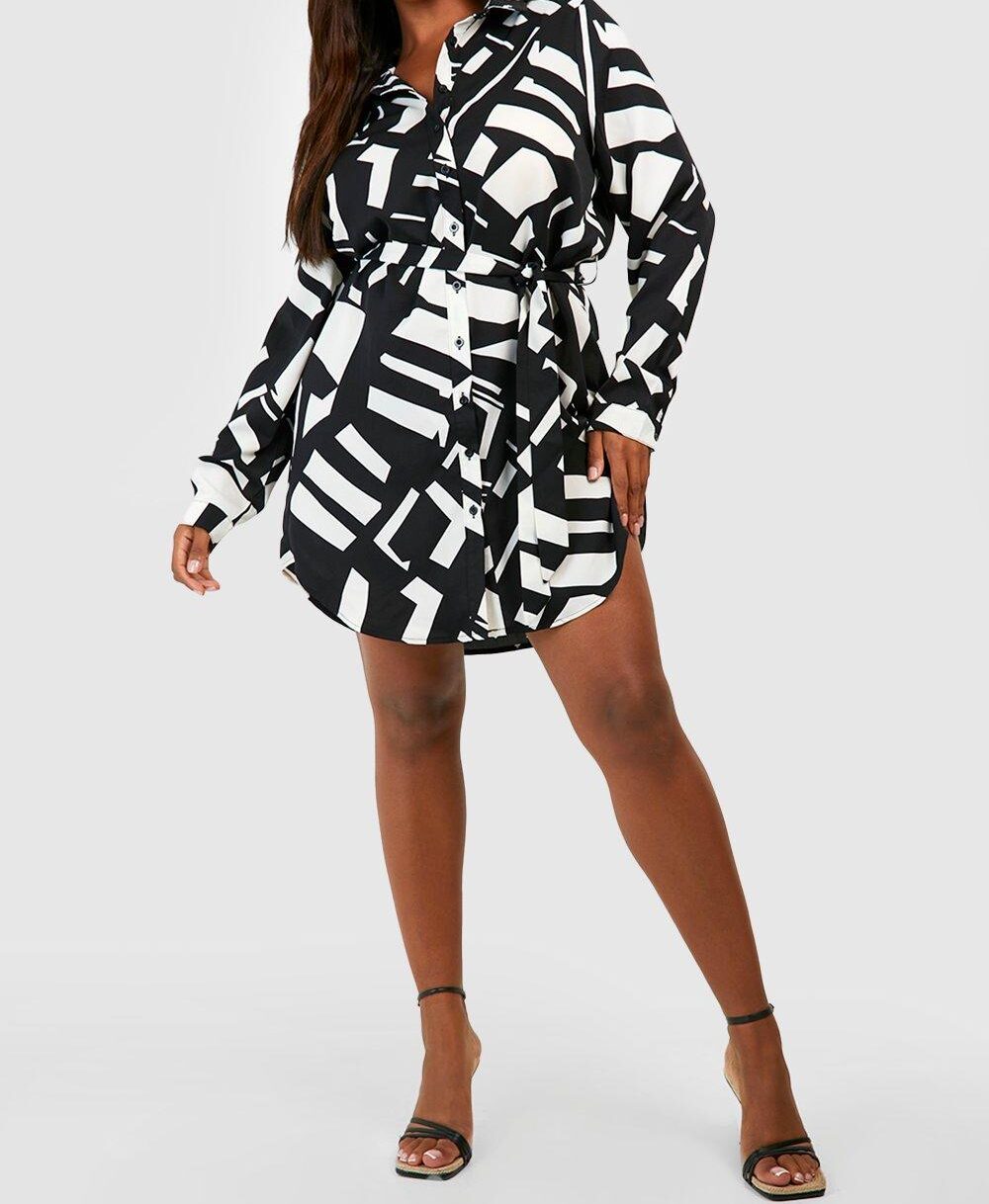 The monochrome print adds a bold yet timeless touch, making it perfect for both casual and dressy occasions. The adjustable tie belt cinches the waist for a flattering fit, while the woven fabric ensures breathability and comfort throughout the day.